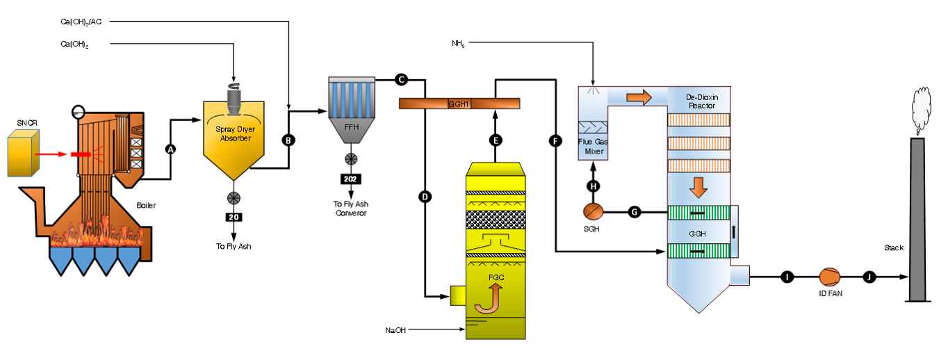 采用SNCR+半干法+干法+布袋除塵器+濕式洗滌+SCR的組合工藝,實(shí)現(xiàn)固體廢棄物焚燒尾氣的超凈排放和煙氣消白。