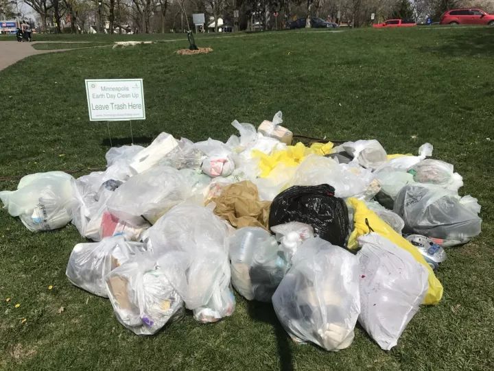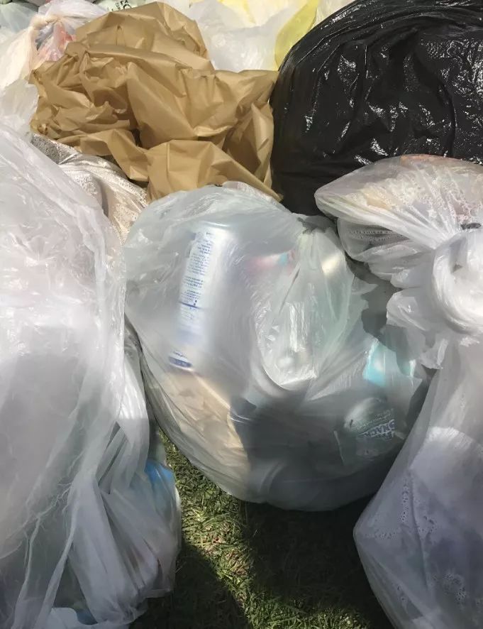 由于距離不遠,我們很快來到了公園門口,我們仔細地觀察了當?shù)乩涞姆诸惽闆r,湊巧當日為地球日,我們一行在公園門口遇到了志愿者收集的垃圾,并且分成了2堆擺放。基于嚴謹務實的工作作風和對國內(nèi)崇洋媚外宣傳的不屑,我們持著懷疑地態(tài)度詳細驗證了一下老美的分類是否真的做的那么完善,我們對2堆垃圾袋進行了拍照取樣。