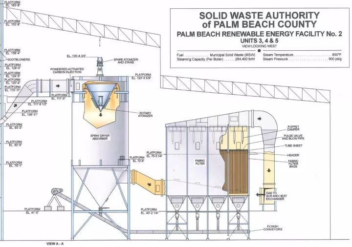 接下來說重點,介紹一下這個焚燒廠。全廠為3x1000t/d的偉倫爐排,煙氣工藝采用了SDA+布袋+GGH+SGH+SCR。該廠位于特朗普老家,而且離得不遠,是目前美國最先進的焚燒廠,也是第一座采用SCR工藝的焚燒廠,2012年開始建設至2015年投入商業(yè)運行,隸屬于佛羅里達州海岸縣固廢管理局。
