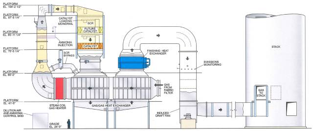 該廠主要燃料為城市生活垃圾,輔助燃料為天然氣。95MW的裝機容量,可供應55000個家庭。單臺鍋爐供熱能力為:284,400 lb/h。我們關注的煙氣區(qū)域分為2個部分,SDA+SCR。