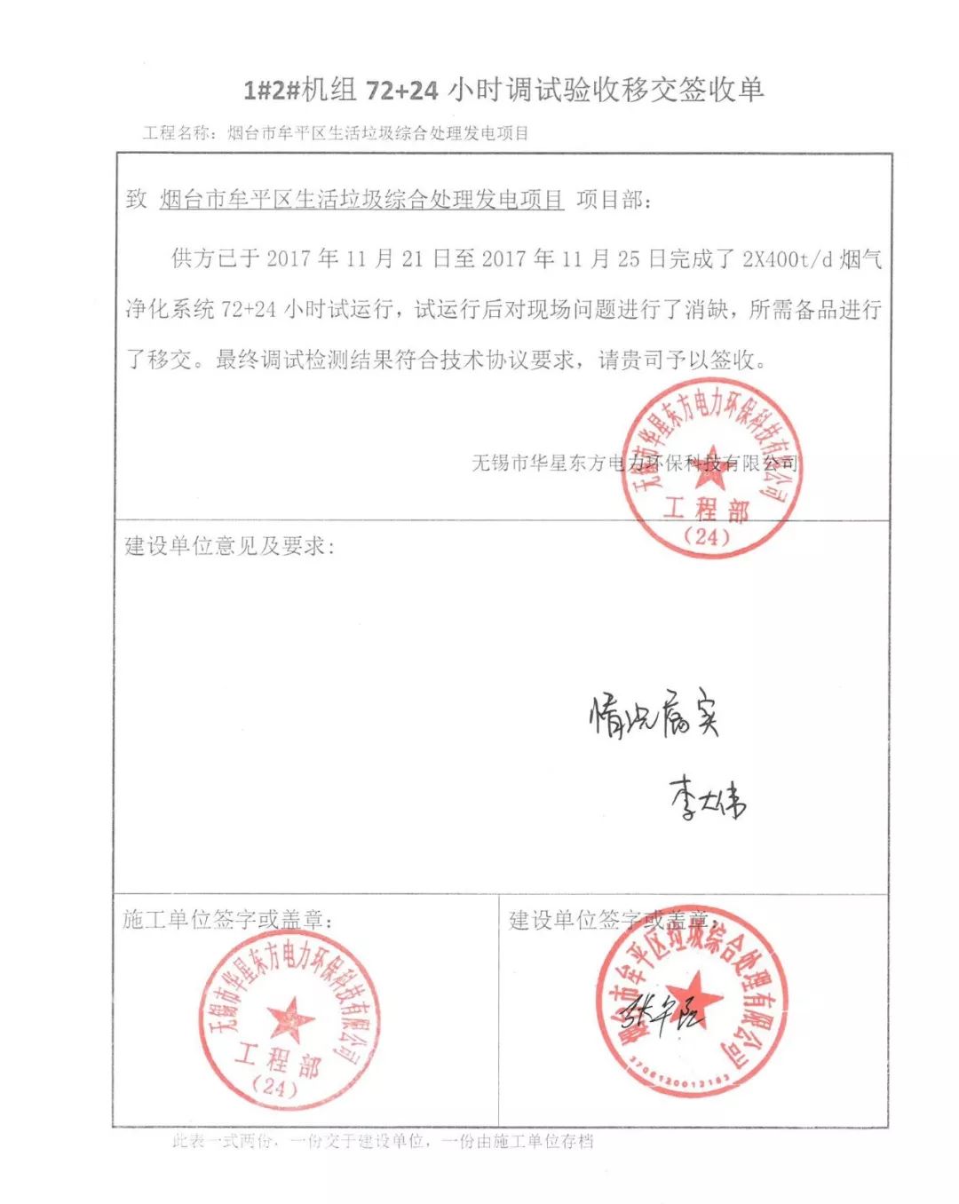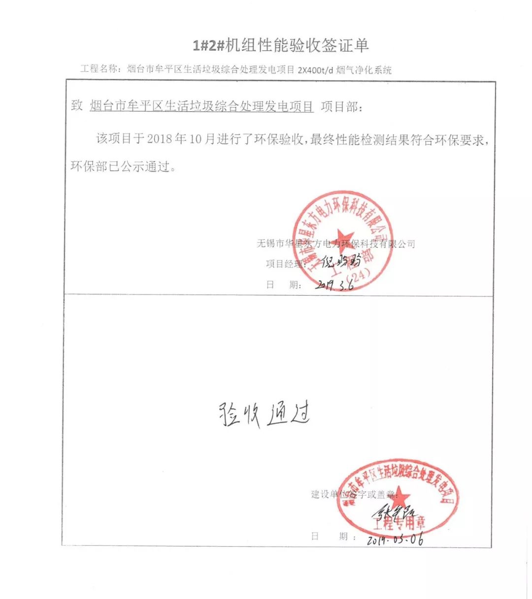我公司承建的煙臺市牟平區生活垃圾綜合處理發電項目煙氣凈化工程于2018年10月通過環保驗收,現該項目運行穩定,各項參數符合設計要求。