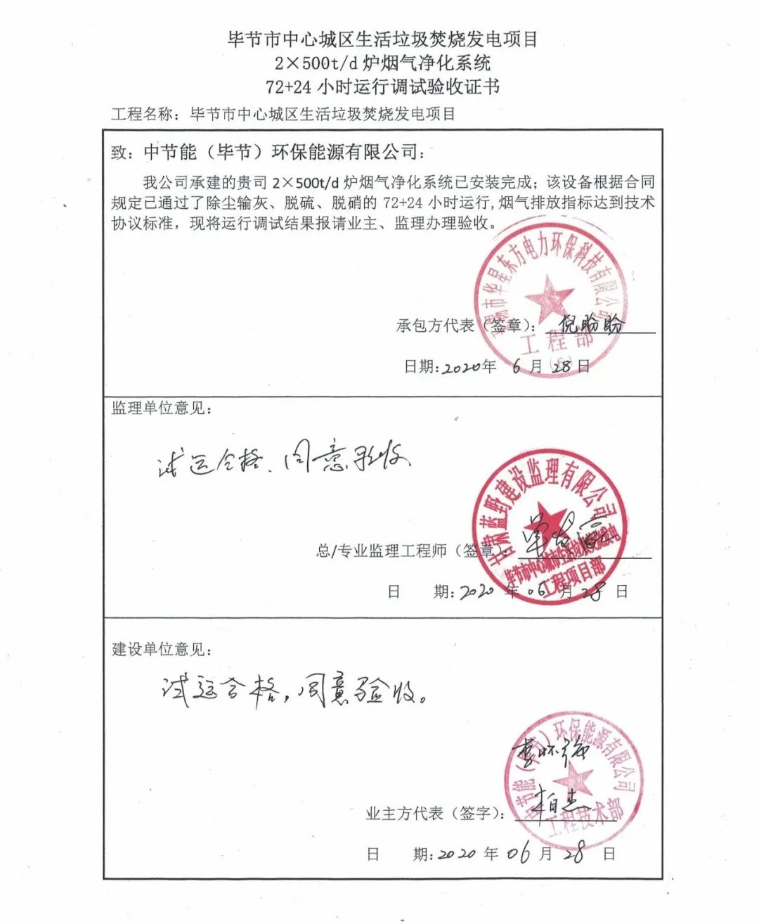 我公司承建的貴州省畢節市中心城區生活垃圾焚燒發電項目煙氣凈化工程于2020年6月28日通過72+24小時試運行。