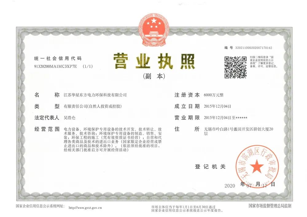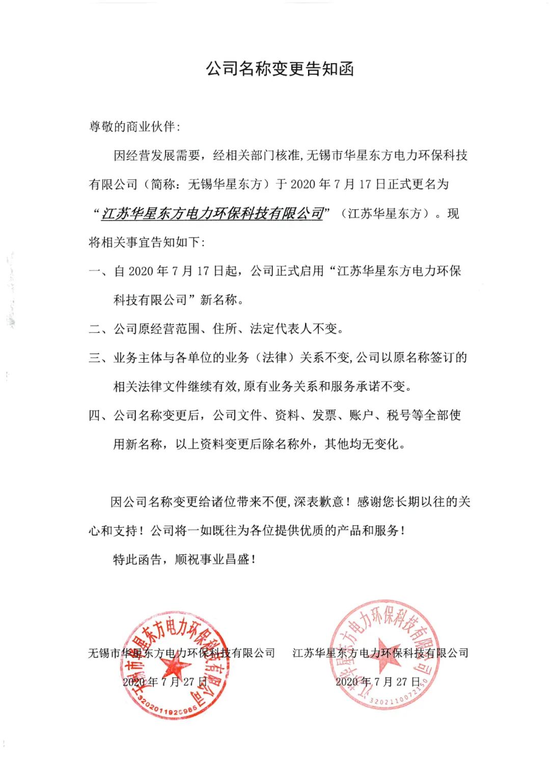 2020年7月17日,無錫市華星東方電力環保科技有限公司正式更名為:“江蘇華星東方電力環保科技有限公司”,以下為變更公告: