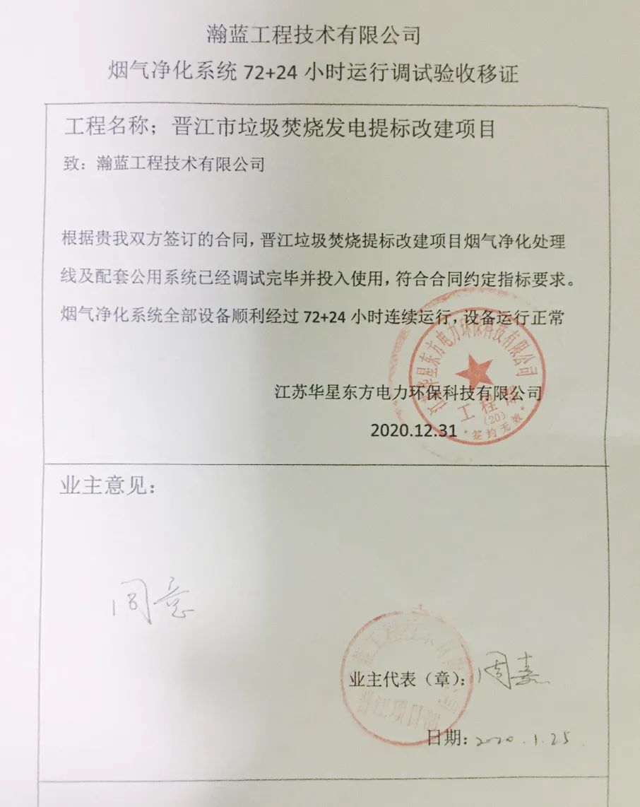 我公司承建的福建省晉江市垃圾焚燒發電提標改建項目煙氣凈化工程于2020年12月31日通過72+24小時試運行。