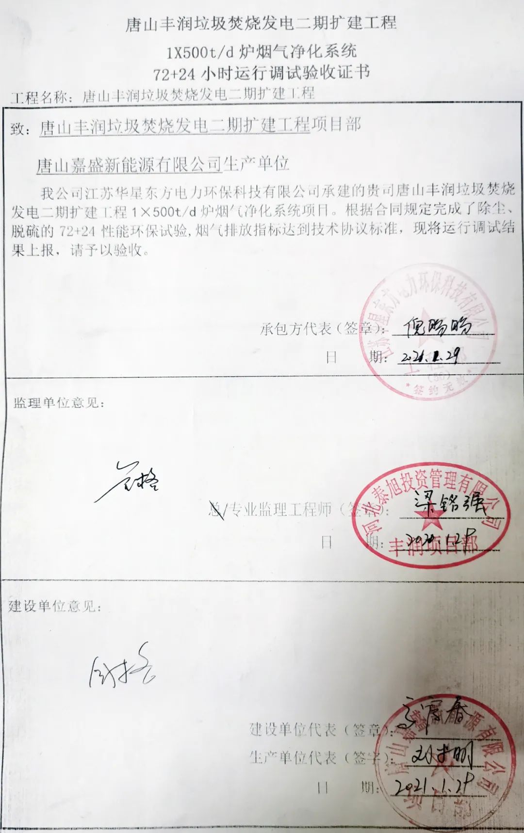 我公司承建的河北省唐山豐潤生活垃圾焚燒發電二期擴建項目煙氣凈化工程于2021年1月29日通過72+24小時試運行。