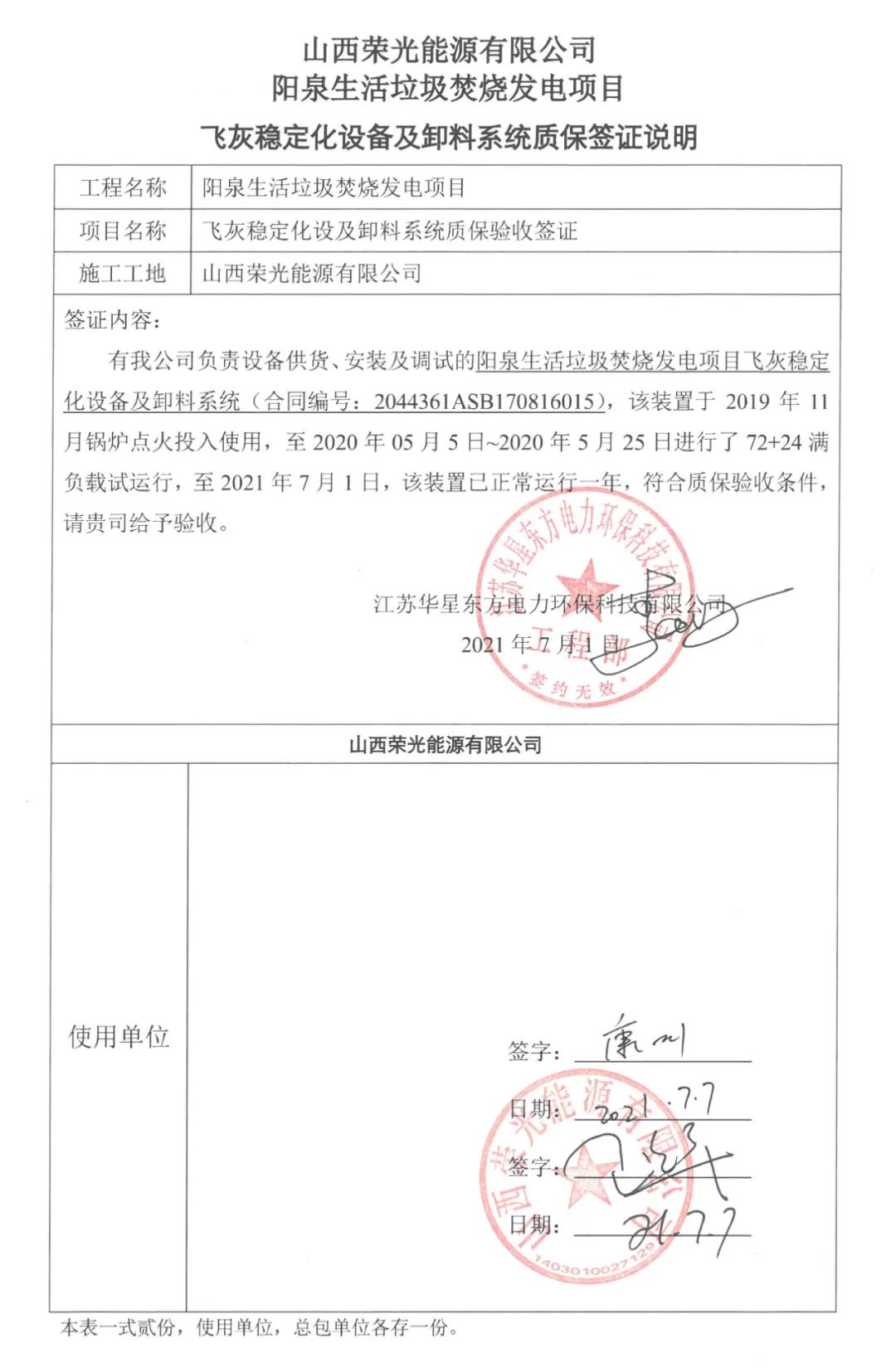 我公司承建的山西省陽泉生活垃圾焚燒發電項目煙氣凈化工程于2021年7月1日通過72+24小時試運行。