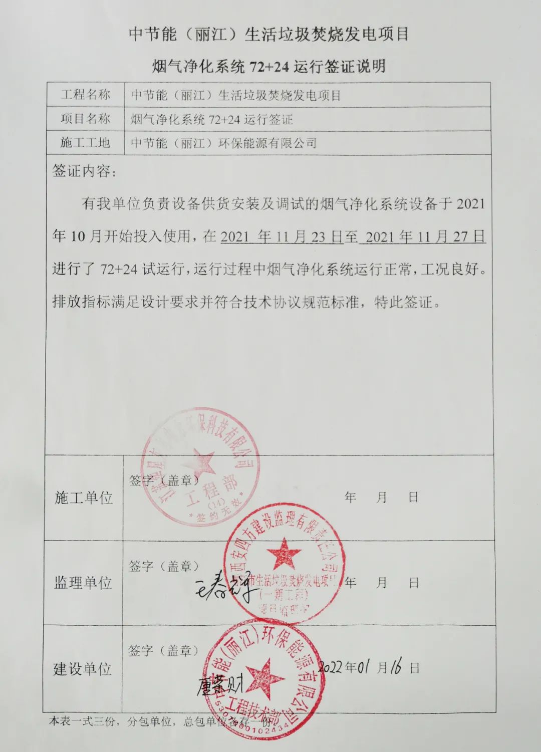 我公司承建的云南省麗江生活垃圾發(fā)電項目煙氣凈化工程于2022年1月16日通過72+24小時試運行。