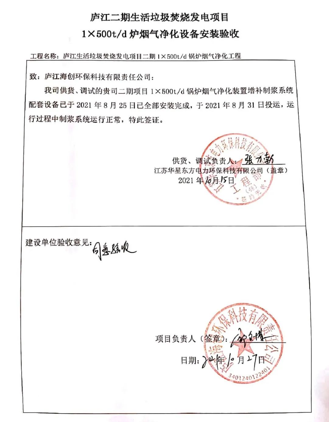 The flue gas cleaning (FGC) project constructed by Huaxing East for Lujiang, Hefei waste Incineration power plant (Phase II ) in Anhui province passed 72+24 hours trial operation on November 1, 2021.