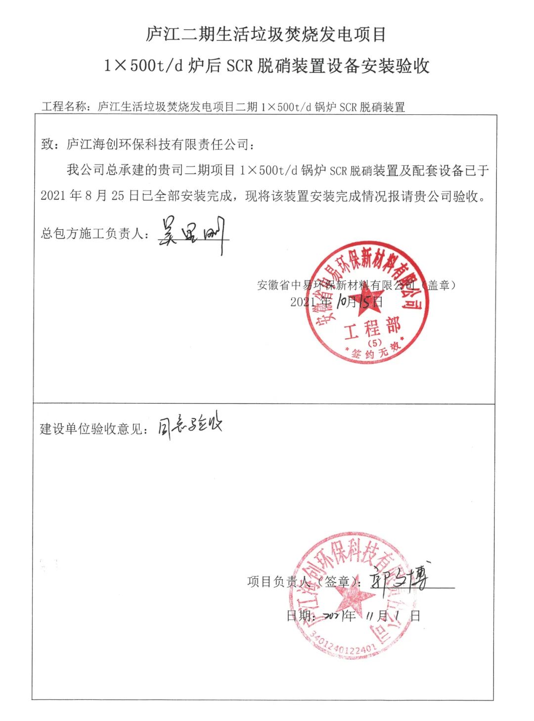 我公司承建的安徽省合肥廬江二期生活垃圾焚燒發電項目煙氣凈化工程于2021年11月1日通過72+24小時試運行。