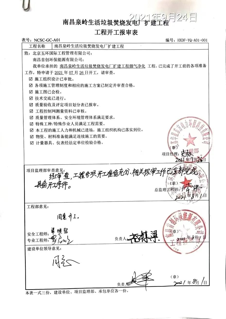 我公司承建的江西省南昌市泉嶺生活垃圾焚燒發(fā)電項(xiàng)目煙氣凈化工程于2021年7月26日開(kāi)工建設(shè)。