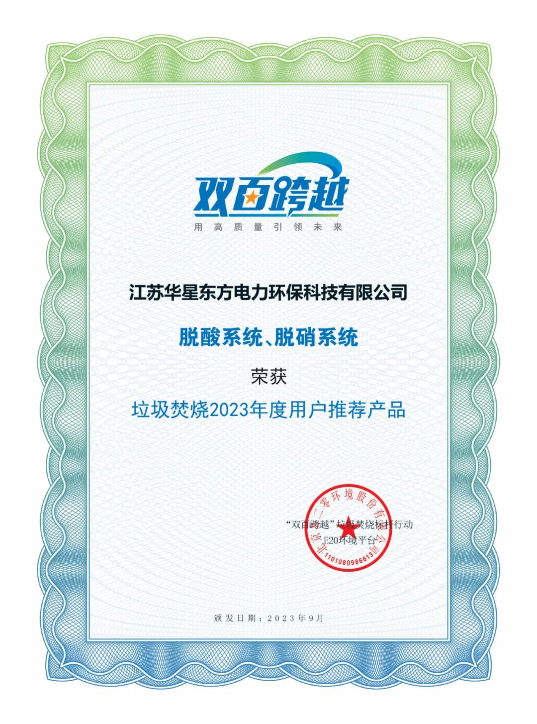 江蘇華星東方在E20環境平臺2023(第十屆)上海固廢熱點論壇現場揭曉的垃圾焚燒領域關鍵裝備產品“年度用戶提名產品品牌”與“年度用戶推薦產品”兩大產品名錄中榮獲垃圾焚燒(脫酸系統、脫硝系統)2023年度用戶推薦產品! Jiangsu Huaxing East Co. won the title of Waste Incineration (Waste Incineration) in the two product lists of "User Nominated Product Brand of the Year" and "User Recommended Product of the Year" for key equipment products in the field of waste incineration, which was announced at the E20 Environmental Platform 2023 (10th) Shanghai Solid Waste Hotspot Forum. Deacidification system, denitrification system) 2023 user recommended products!