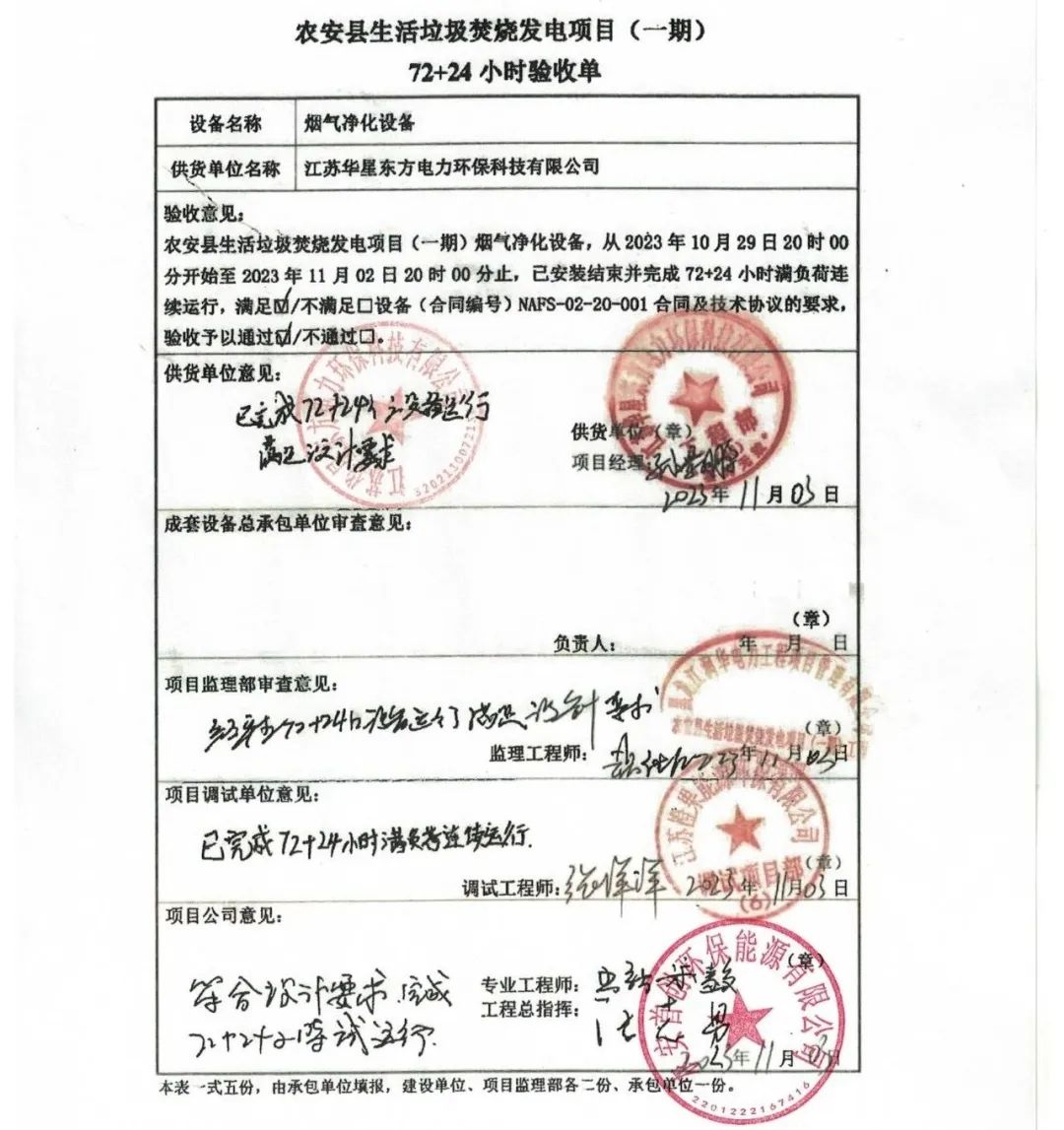 我公司承建的吉林省長春市農安生活垃圾焚燒發電項目煙氣凈化工程于2023年11月02日通過72+24小時試運行。 The flue gas cleaning project of agricultural household waste incineration power generation project in Changchun city, Jilin province, which was constructed by our company, passed 72+24 hours trial operation on November 02, 2023.