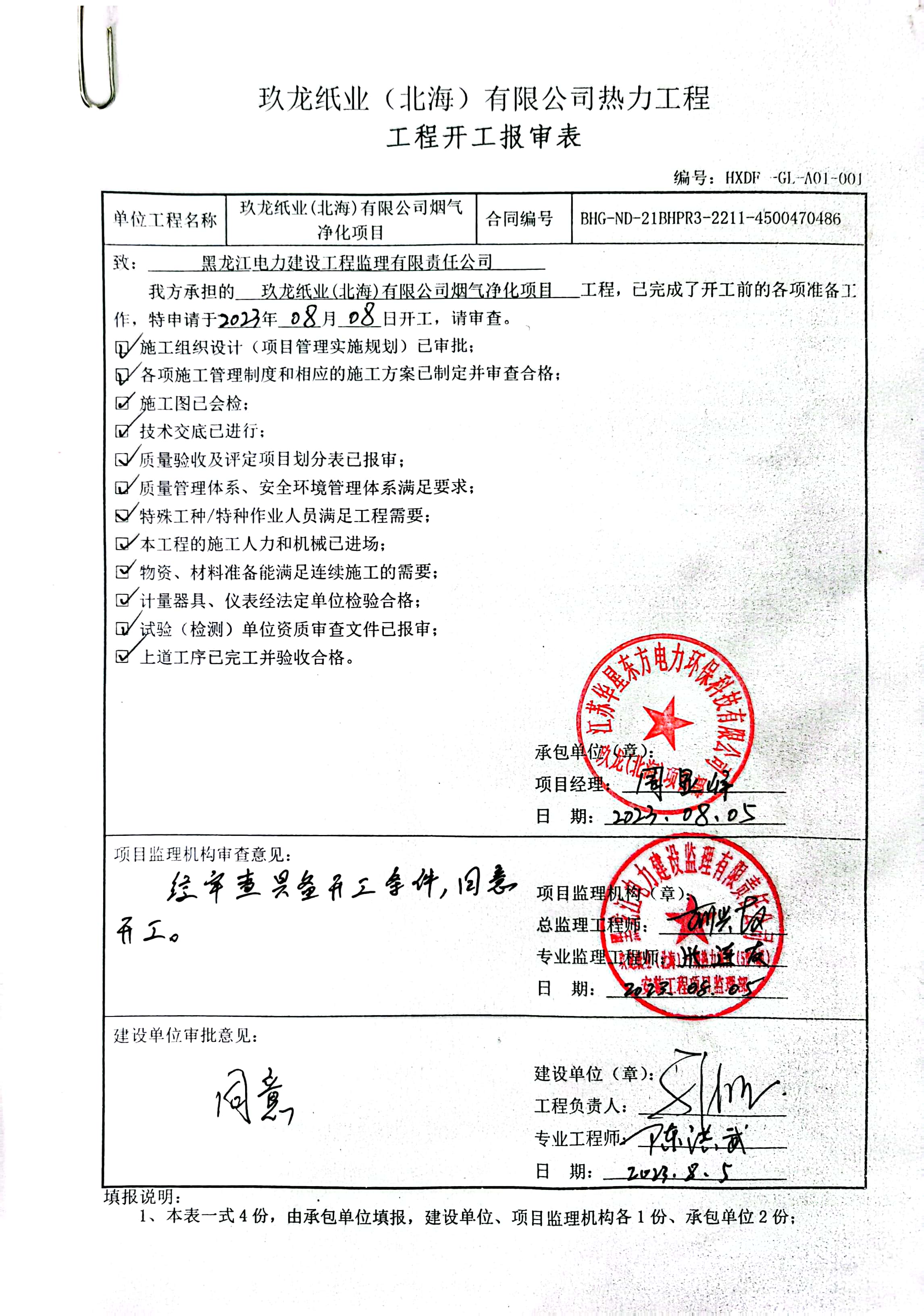 我公司承建的廣西省北海市玖龍紙業(yè)熱力發(fā)電項目煙氣凈化工程于2023年08月08日開工建設。