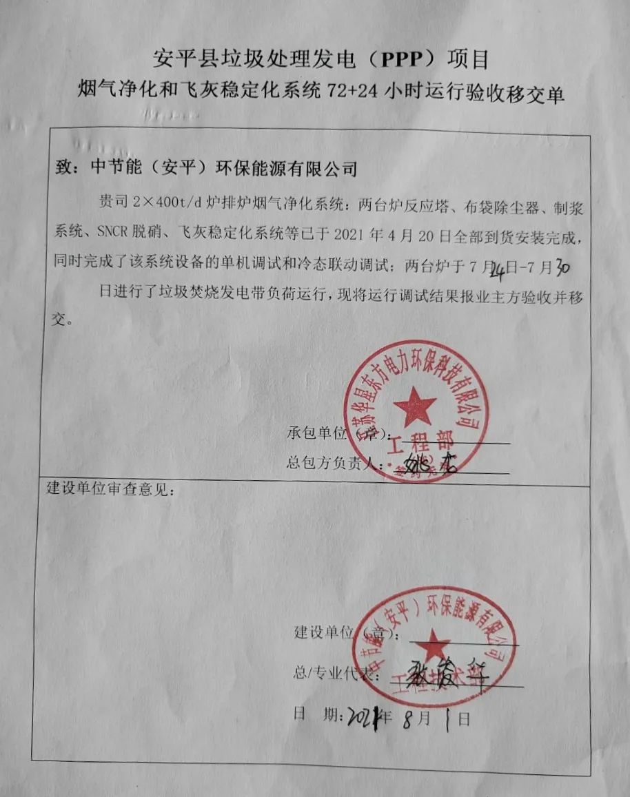 The FGC project  constructed by Huaxing for Anping waste incineration power plant in Hengshui, Hebei passed 72+24 hours trial operation on August  01, 2021.