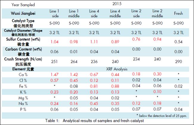 上述測定表明4條線催化劑均出現了K、Ca、Na、Mg等堿金屬中毒現象;3#線催化劑表面S未見明顯升高現象,其余幾條線S出現了升高現象;除2#線外,其余催化劑均有Cl含量升高現象;1#到4#線催化劑活性分別下降24%和31% 、4%和5%、27%和28%、25%和40%。與此同時,粒子狀催化劑在中國其他同類項目中的應用也遇到了類似問題。