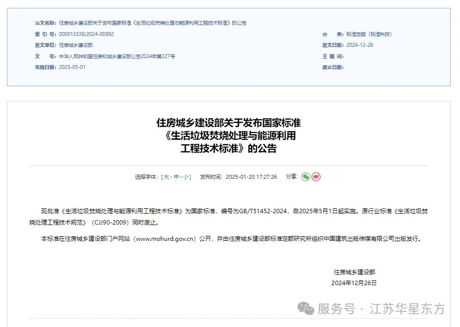從住建部網站獲悉,由中國城市建設研究院有限公司等牽頭主編,江蘇華星東方環保科技有限公司等17家單位聯合參編的《生活垃圾焚燒處理與能源利用工程技術標準》(GB/T51452-2024)(以下簡稱標準)已獲批成為國家標準,將于今年5月1日起實施。 It is learned from the official website of the Ministry of Housing and Urban-Rural Development that the "Engineering Technical Standard for Household Waste Incineration and Energy Utilization" (GB/T51452-2024) (hereinafter referred to as the standard) jointly compiled by China Urban Construction Research Institute Co., Ltd. and 17 other units, including Jiangsu Huaxing East Environmental Protection Technology Co., LTD.) has been approved as the national standard. It will be implemented on May 1st. this year.